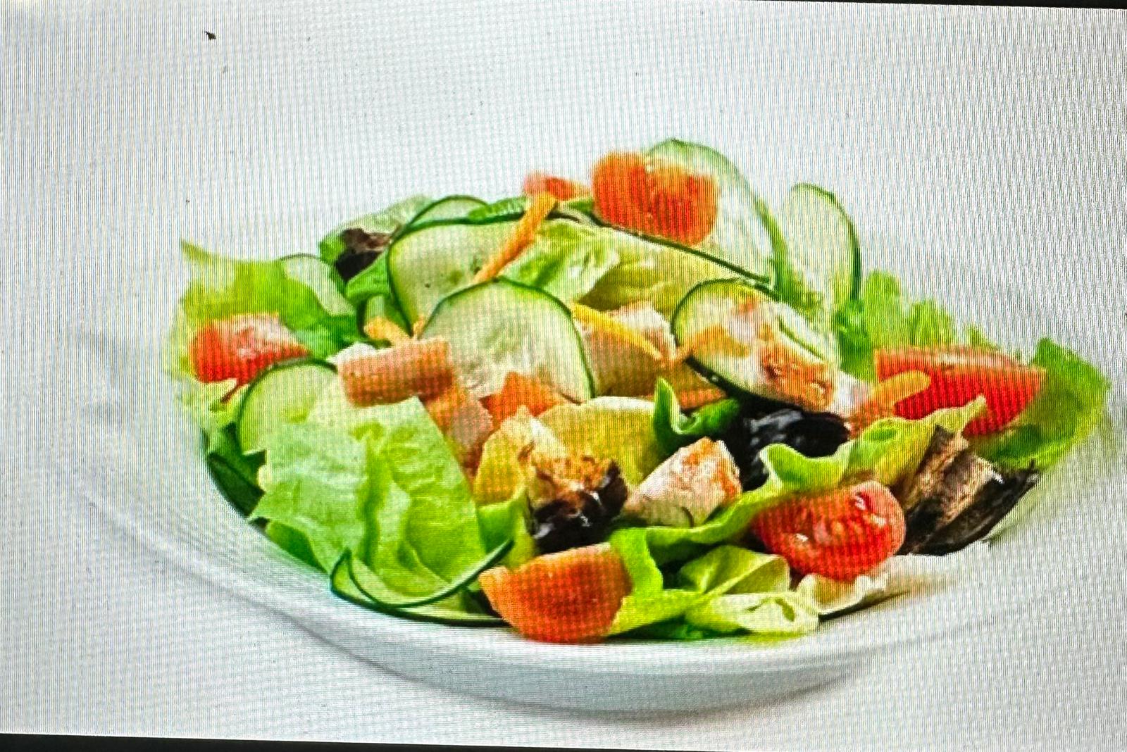 Salat, Tomaten, Karotten, Gurken, Schinken, Käse, gekochtes Ei und Oliven.