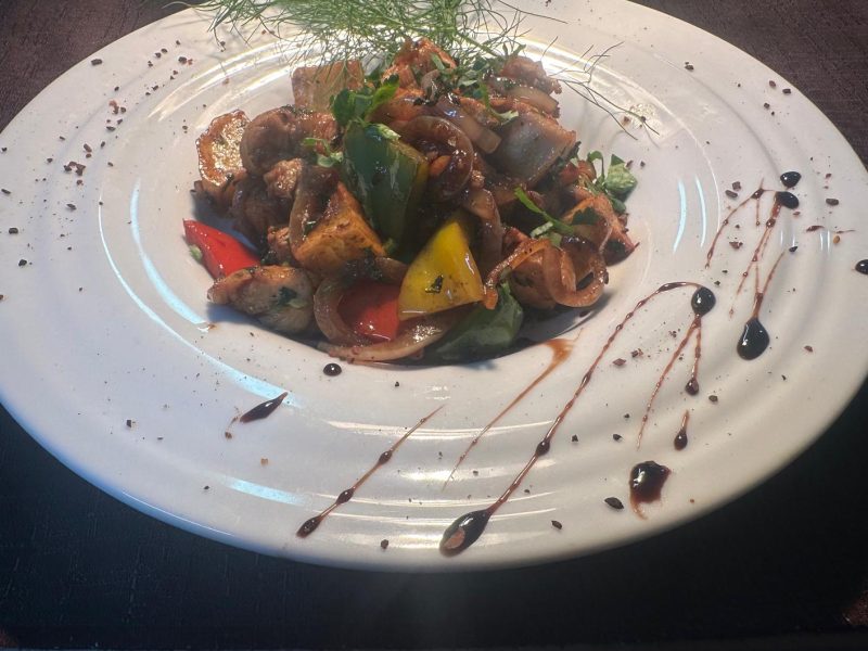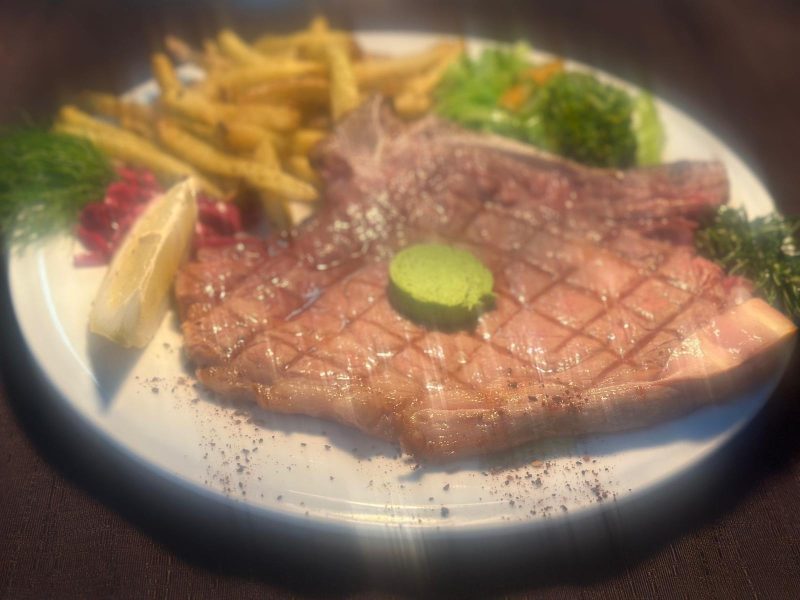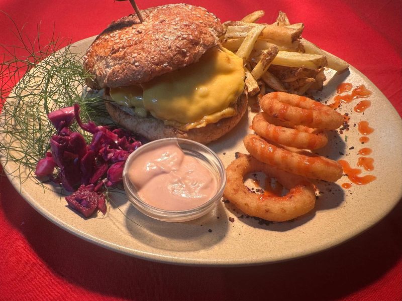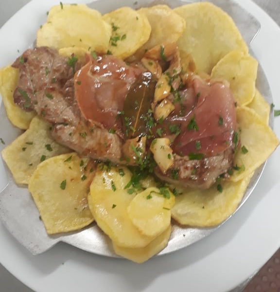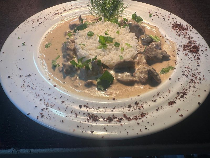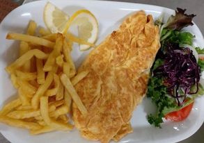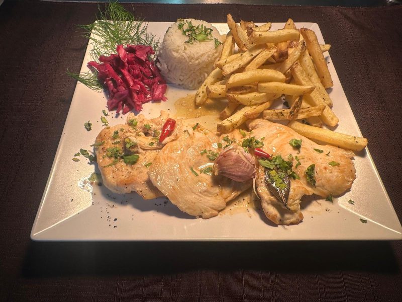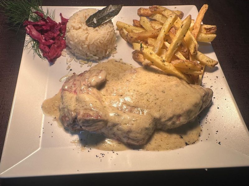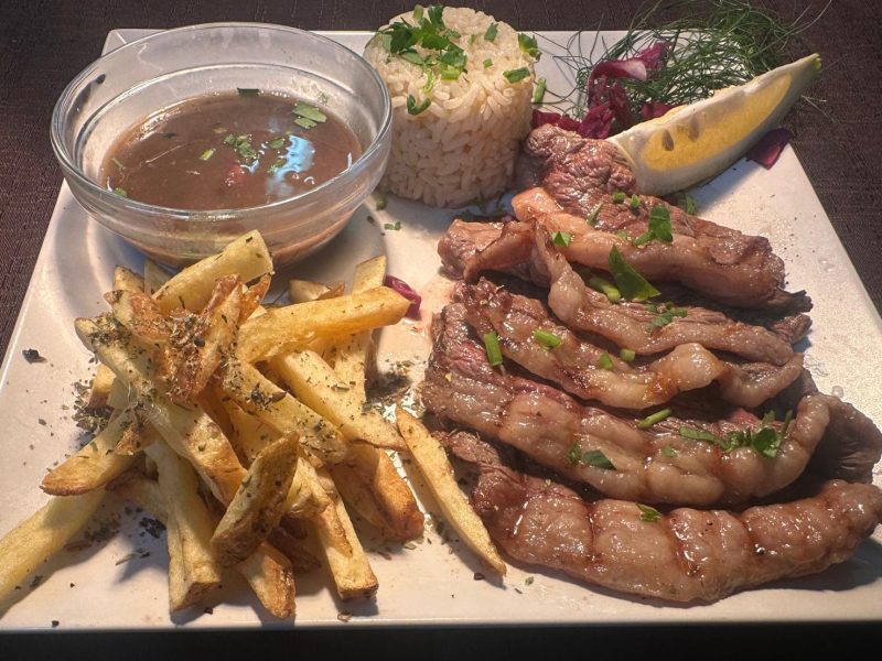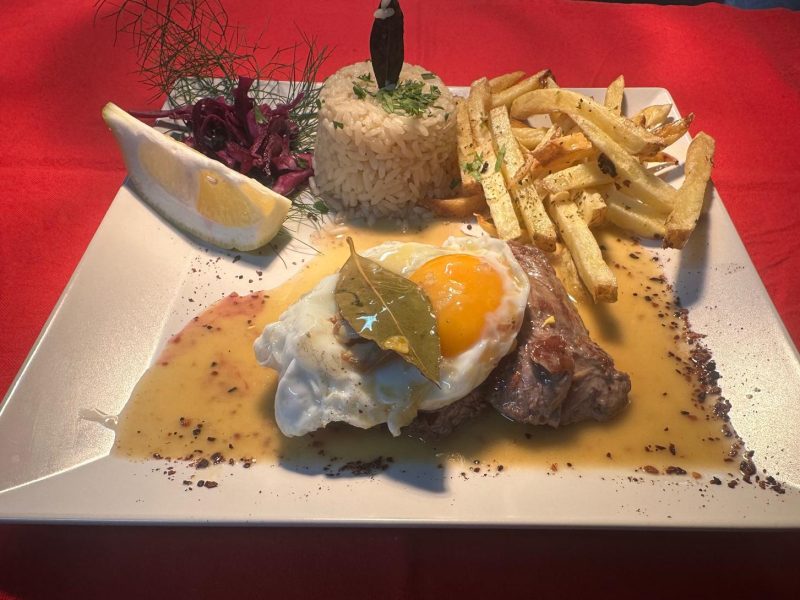 servi Avec Frites, Riz et Oeuf Étoilé.