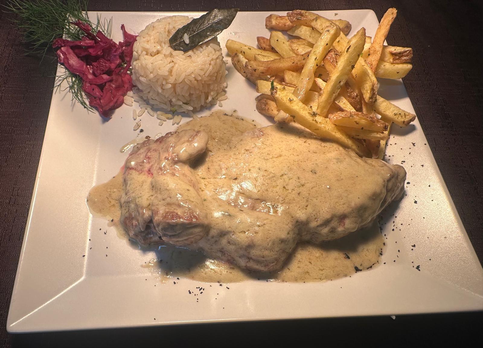 servido com Batata Frita e legumes.